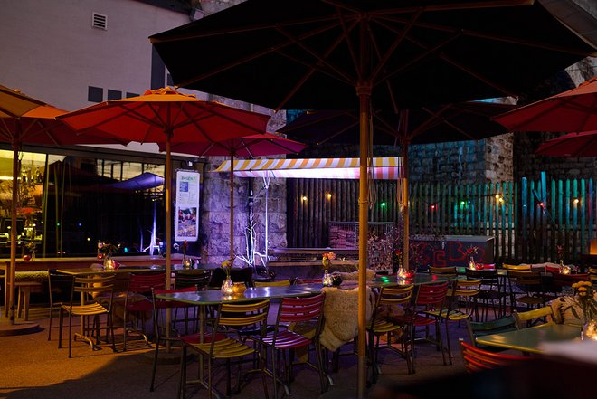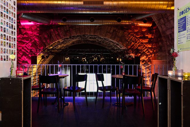 Bogen F has a gallery, bar, and stage, as well as professional sound and lighting systems and beamer technology. Its 120 sq.m can accommodate 150 guests.